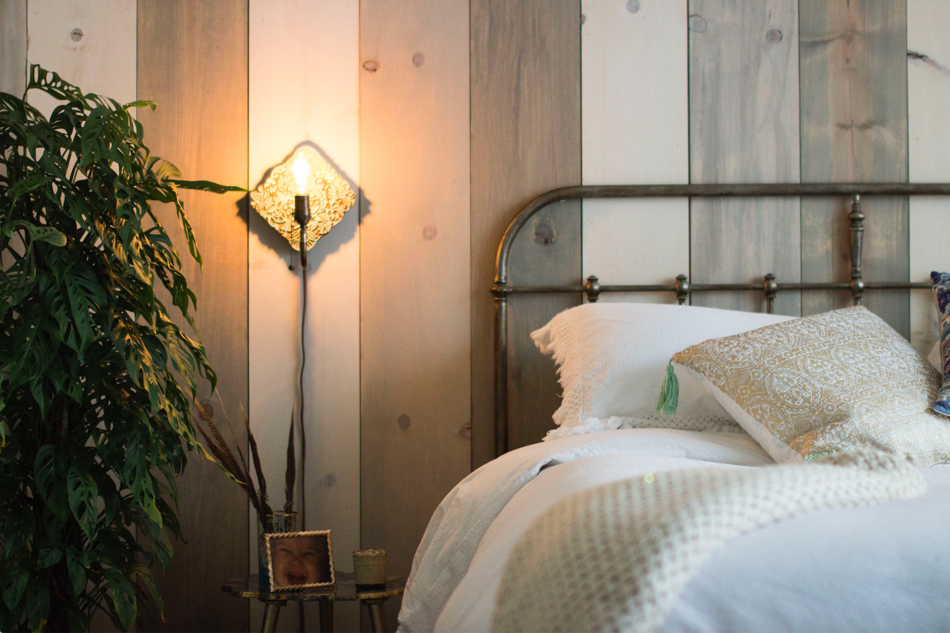 Once the boards were painted, I left them to dry the garage. Once dry, I lined them up against the garage wall the way I wanted them on the bedroom wall. It made it so much easier when we installed them and allowed me to play around with color and texture a bit before we installed them.